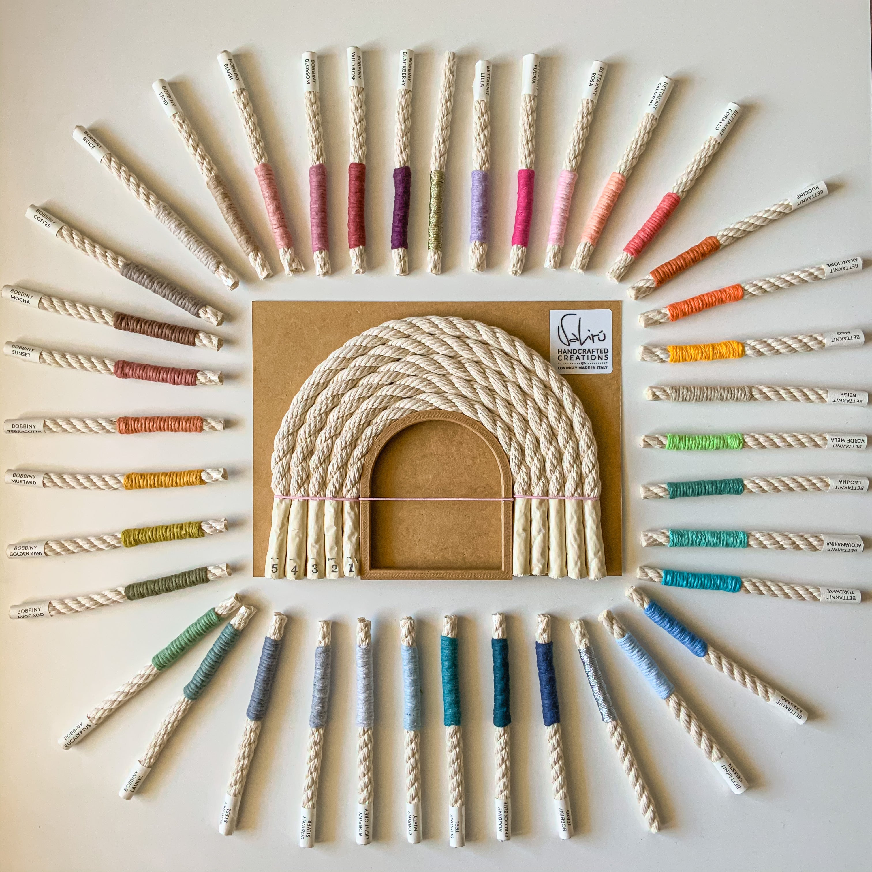 Per gni colore scelto riceverai 6m di filato che corrisponde alla lunghezza necessaria per realizzare l'arco più grande del tuo arcobaleno 22x18cm, quindi nessun timore! Ogni cromia che sceglierai sarà abbastanza lunga per essere arrotonata sulle tue corde.