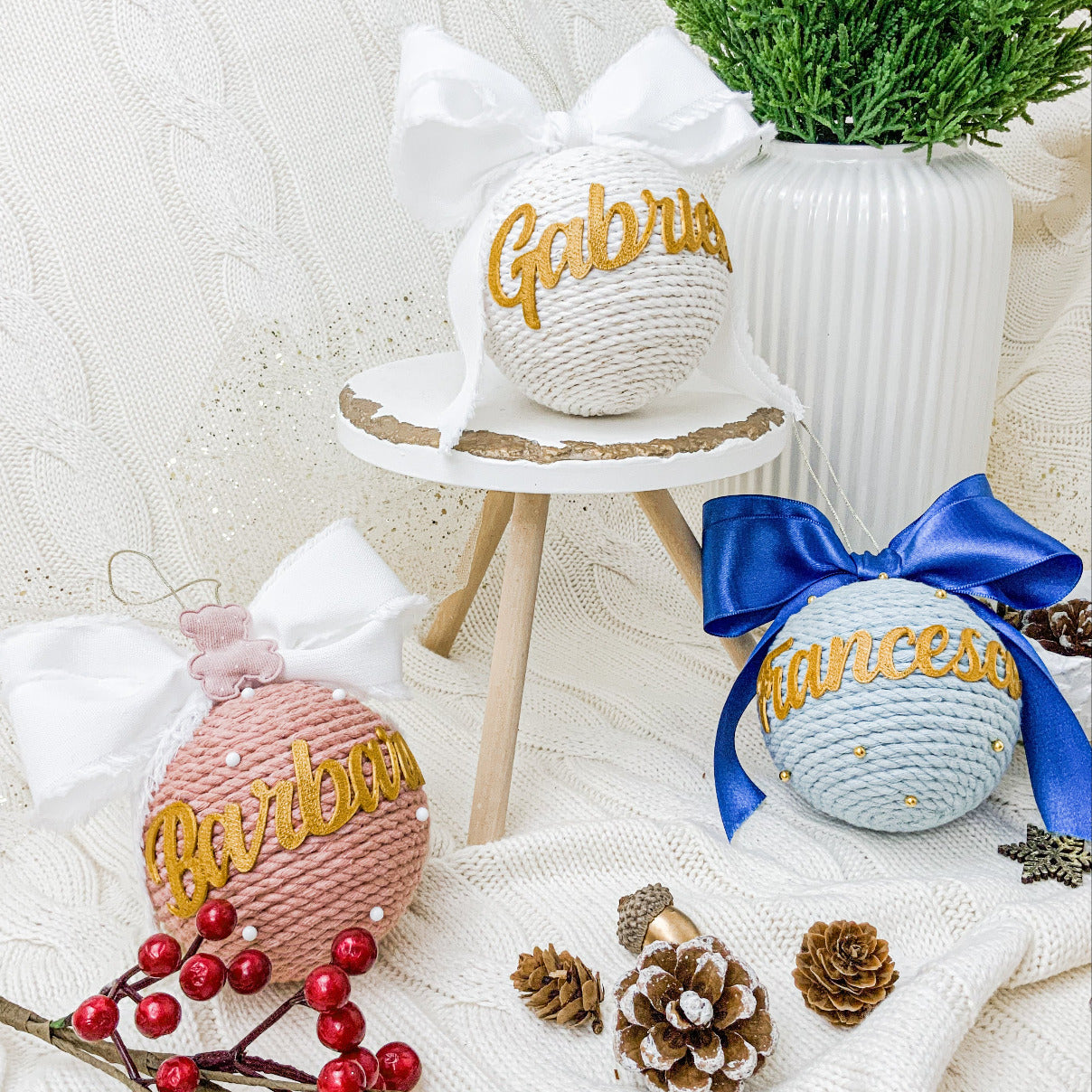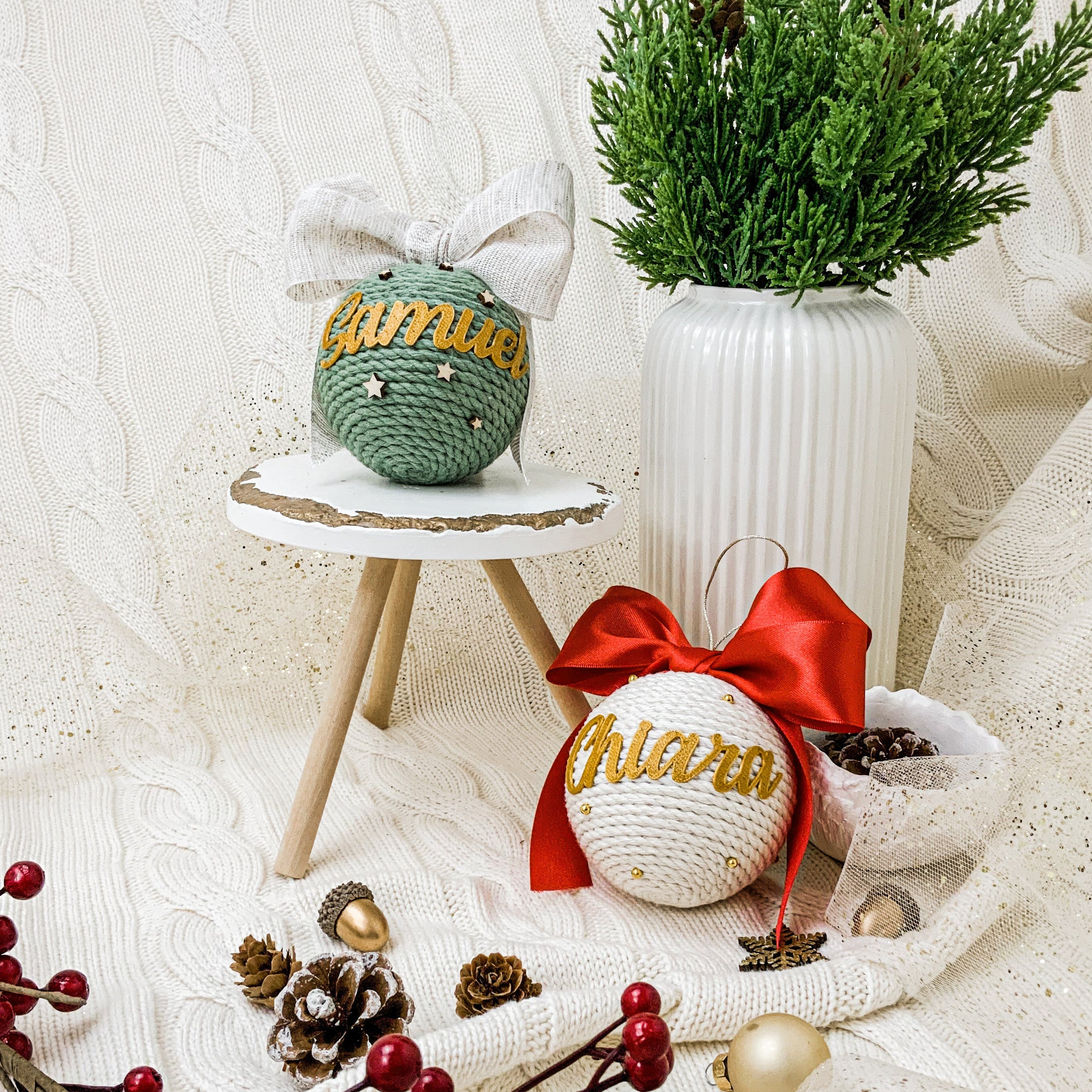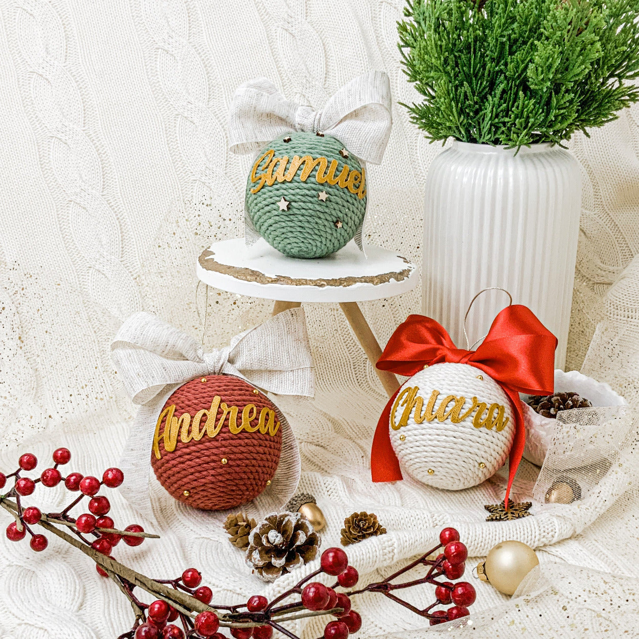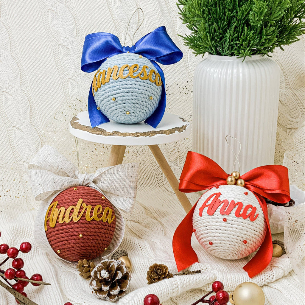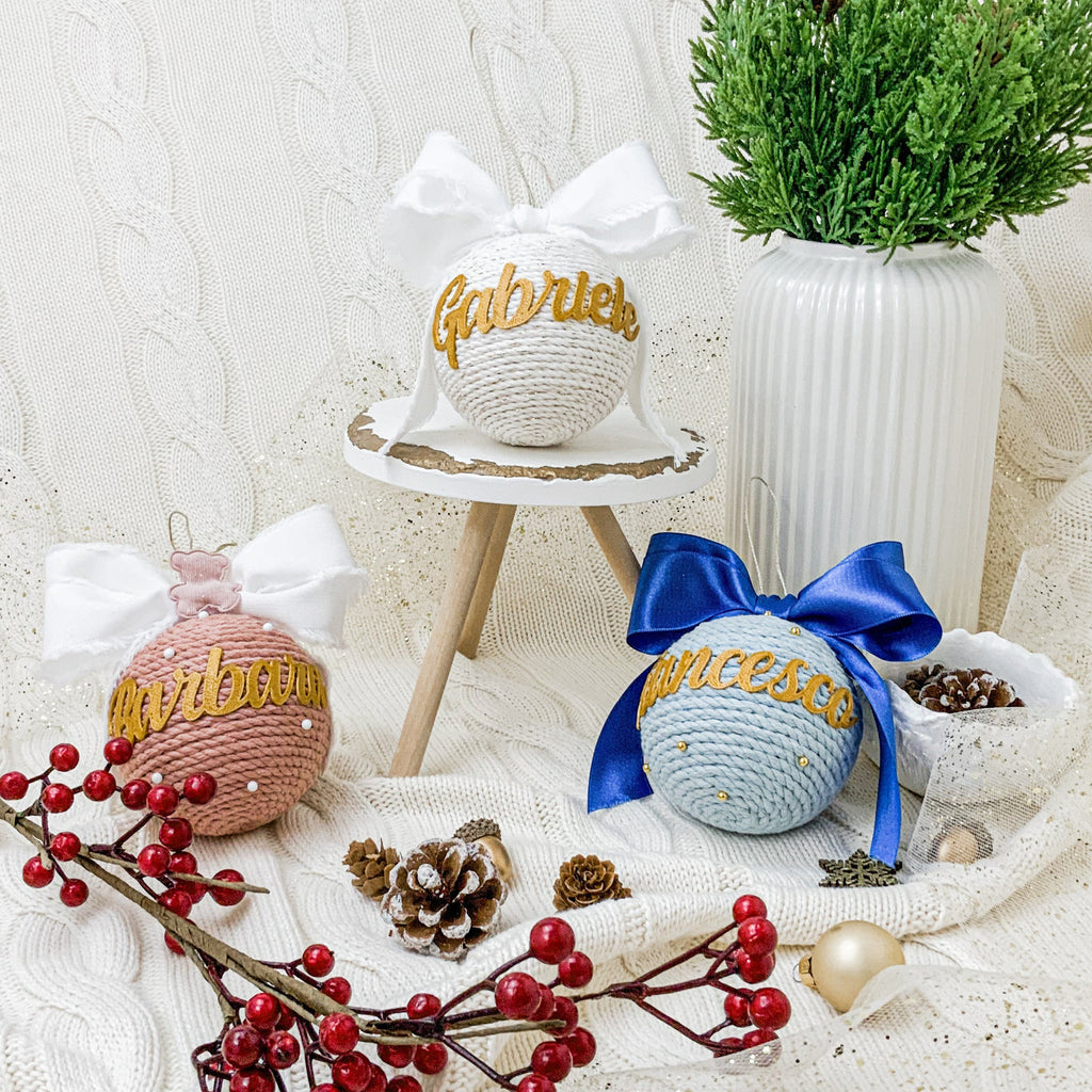 Porta la magia del Natale nella tua casa con le nostre Palline di Natale in corda da circa 11 cm, personalizzabile con nome, colore e decori. Ogni pallina è realizzata a mano con materiali di alta qualità e impreziosita da un elegante fiocco in tinta, ideale per aggiungere un tocco unico e raffinato al tuo albero o ai tuoi ambienti natalizi.