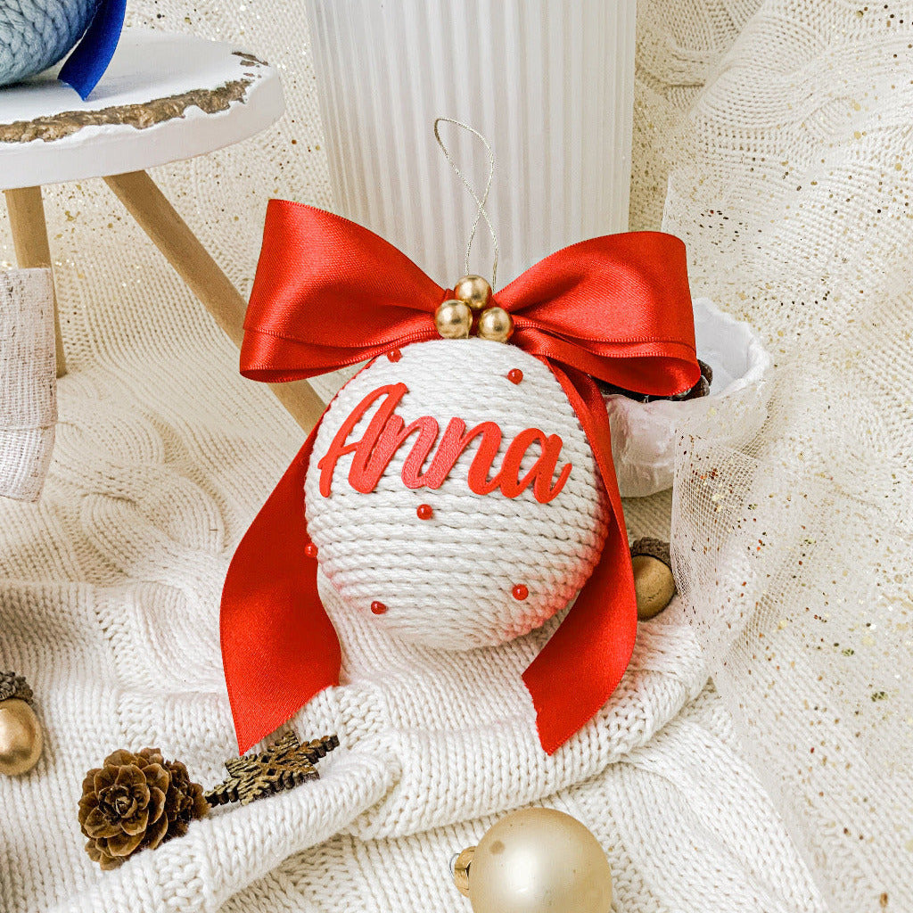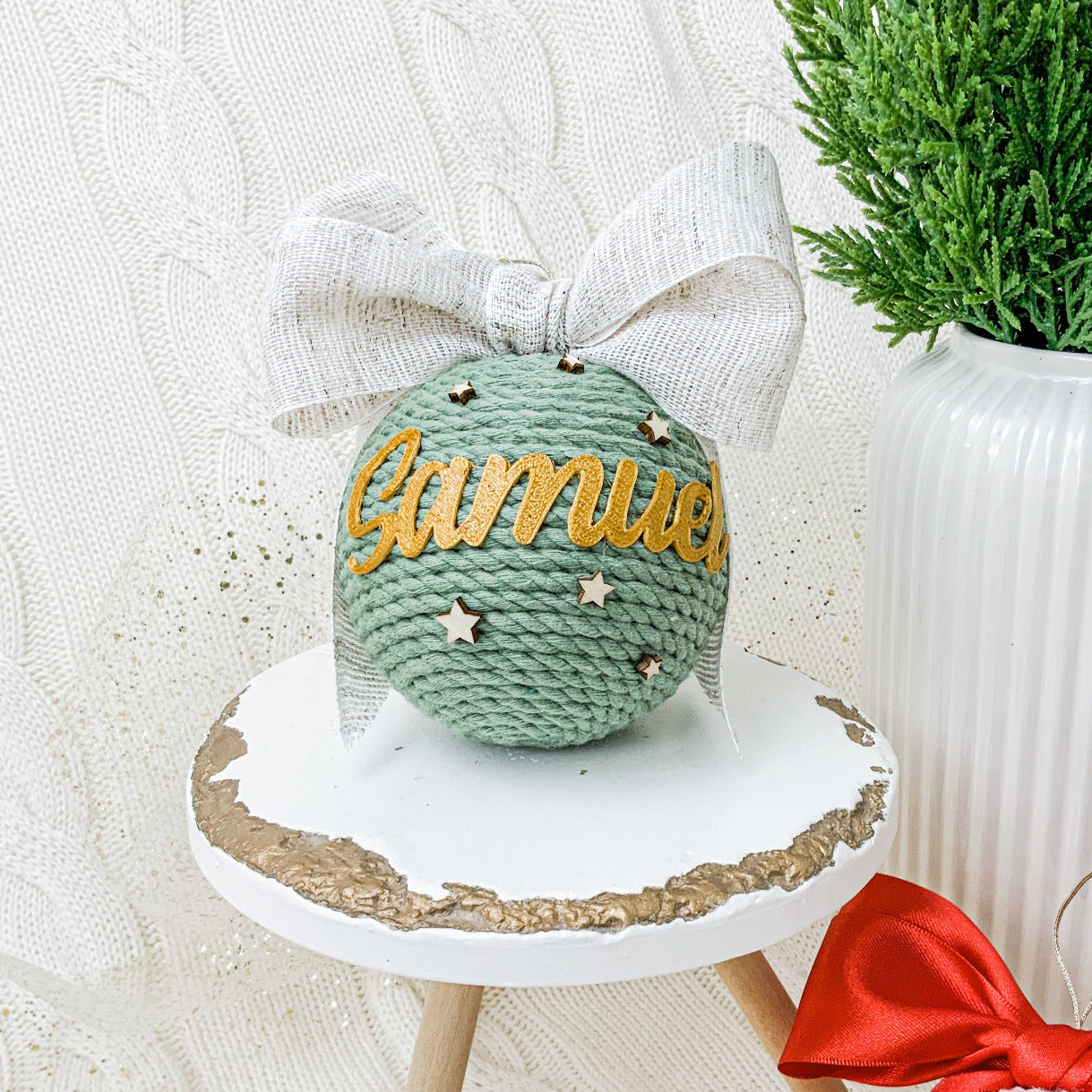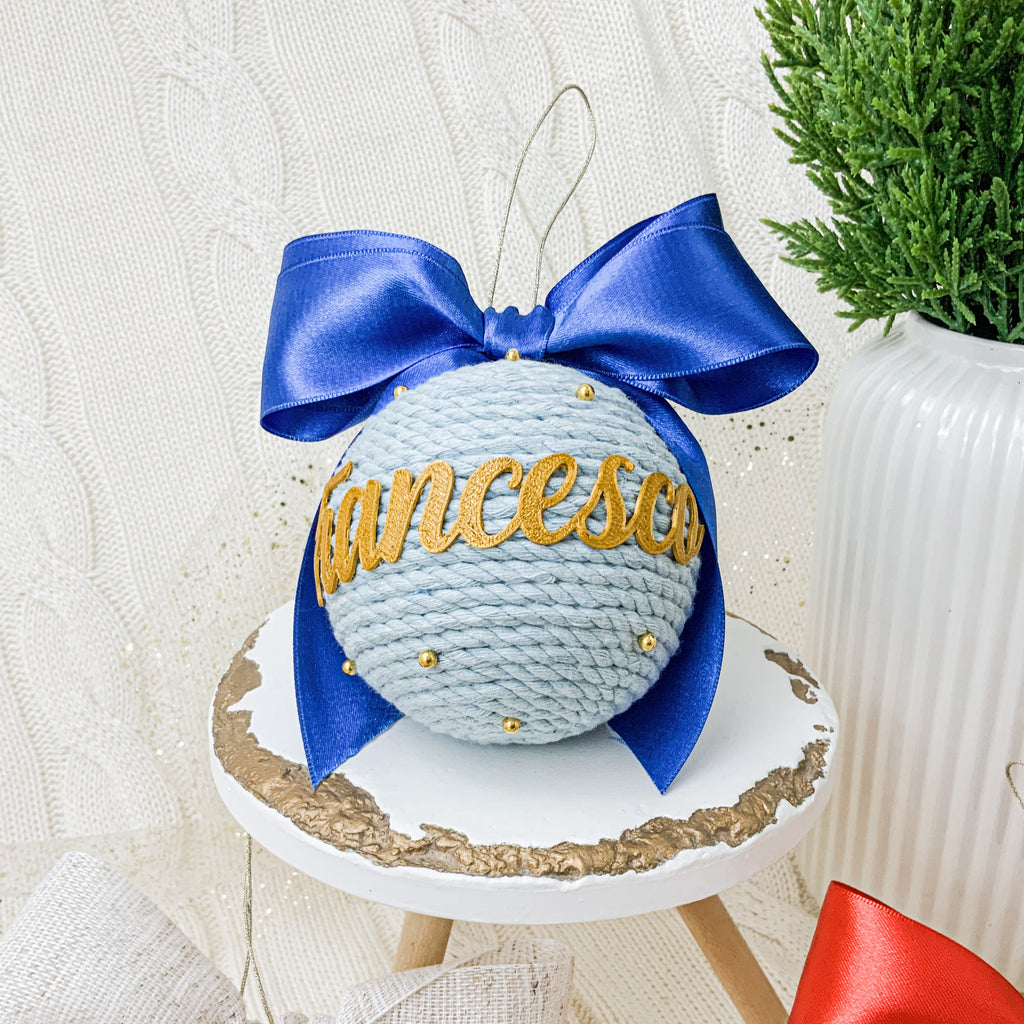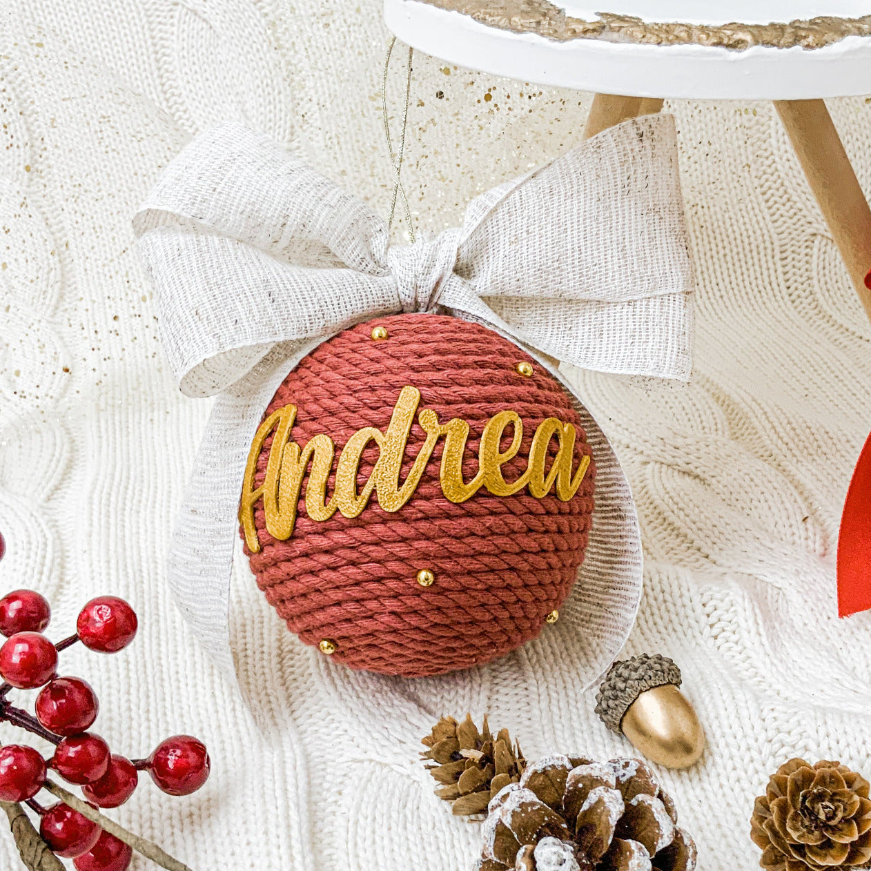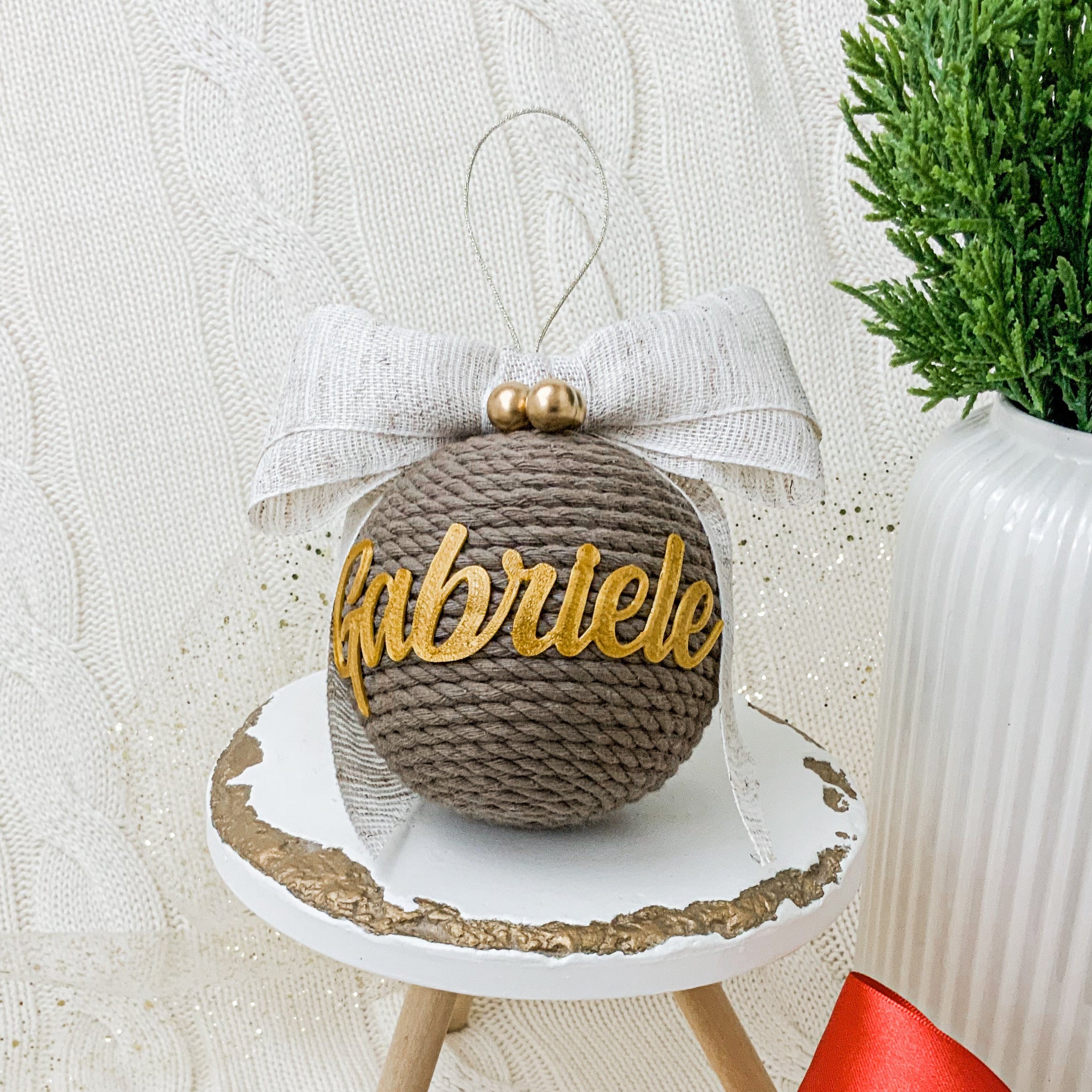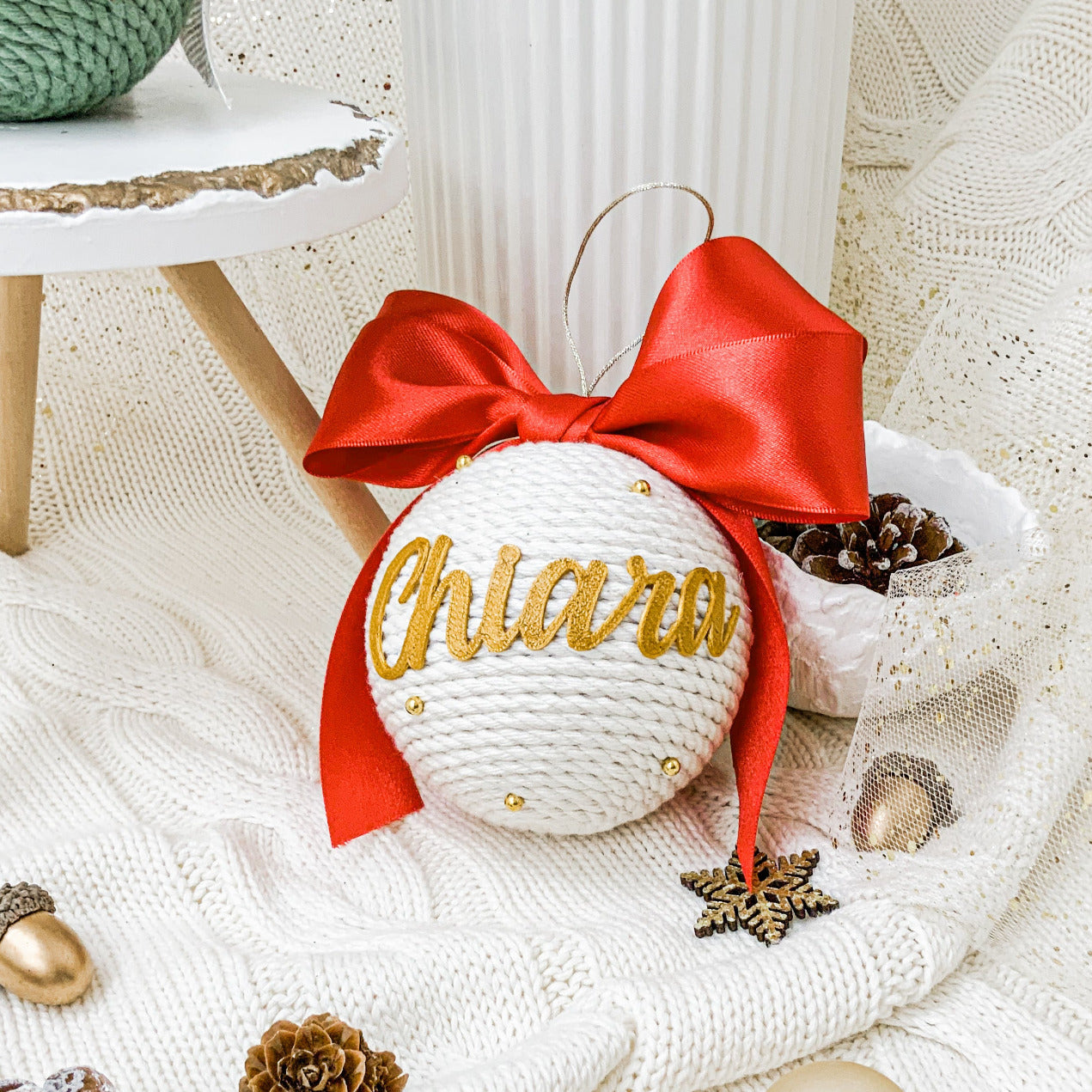 Porta la magia del Natale nella tua casa con le nostre Palline di Natale in corda da circa 11 cm, personalizzabile con nome, colore e decori. Ogni pallina è realizzata a mano con materiali di alta qualità e impreziosita da un elegante fiocco in tinta, ideale per aggiungere un tocco unico e raffinato al tuo albero o ai tuoi ambienti natalizi.