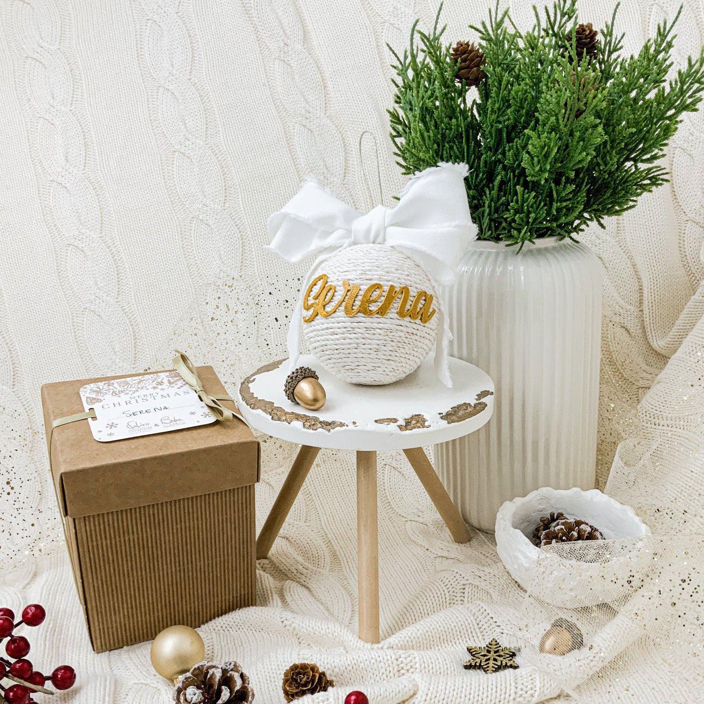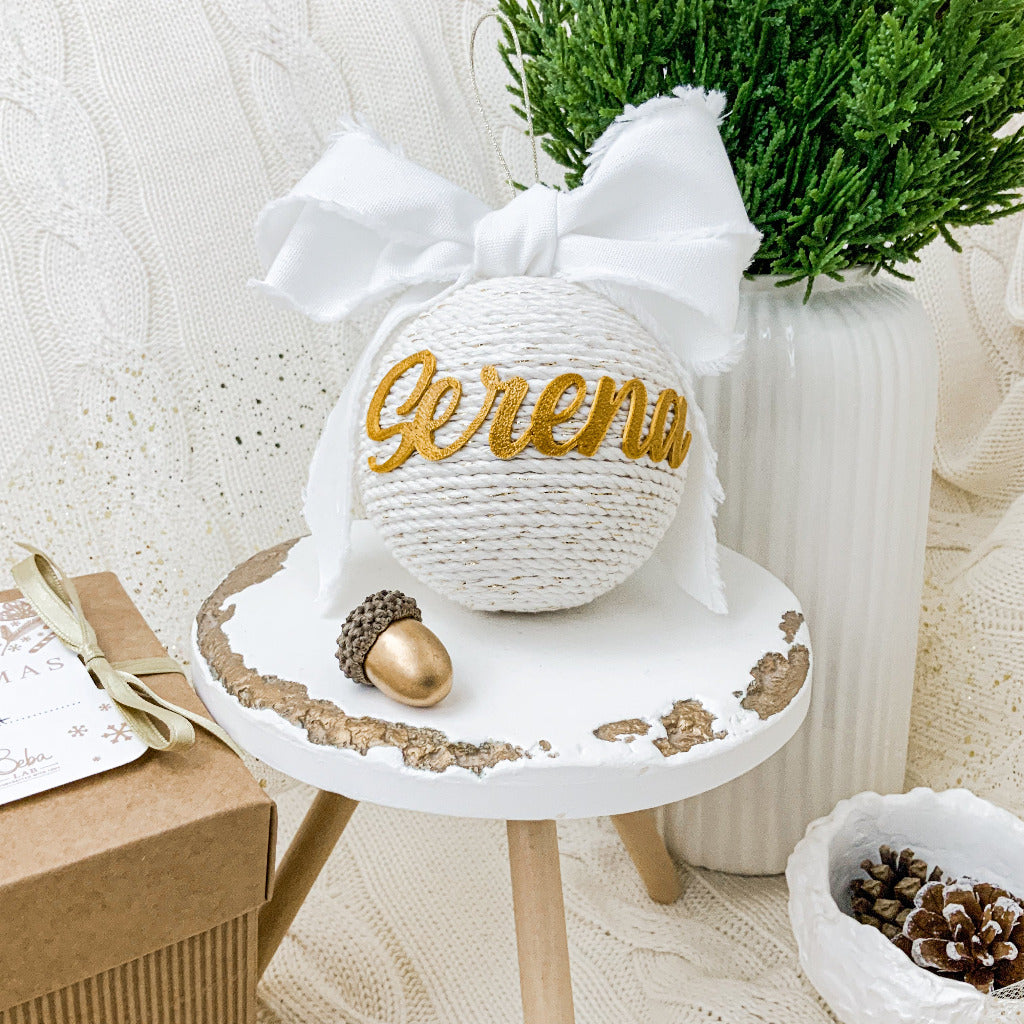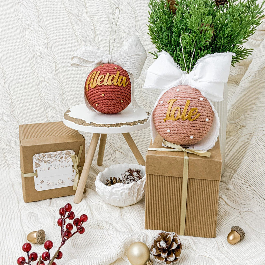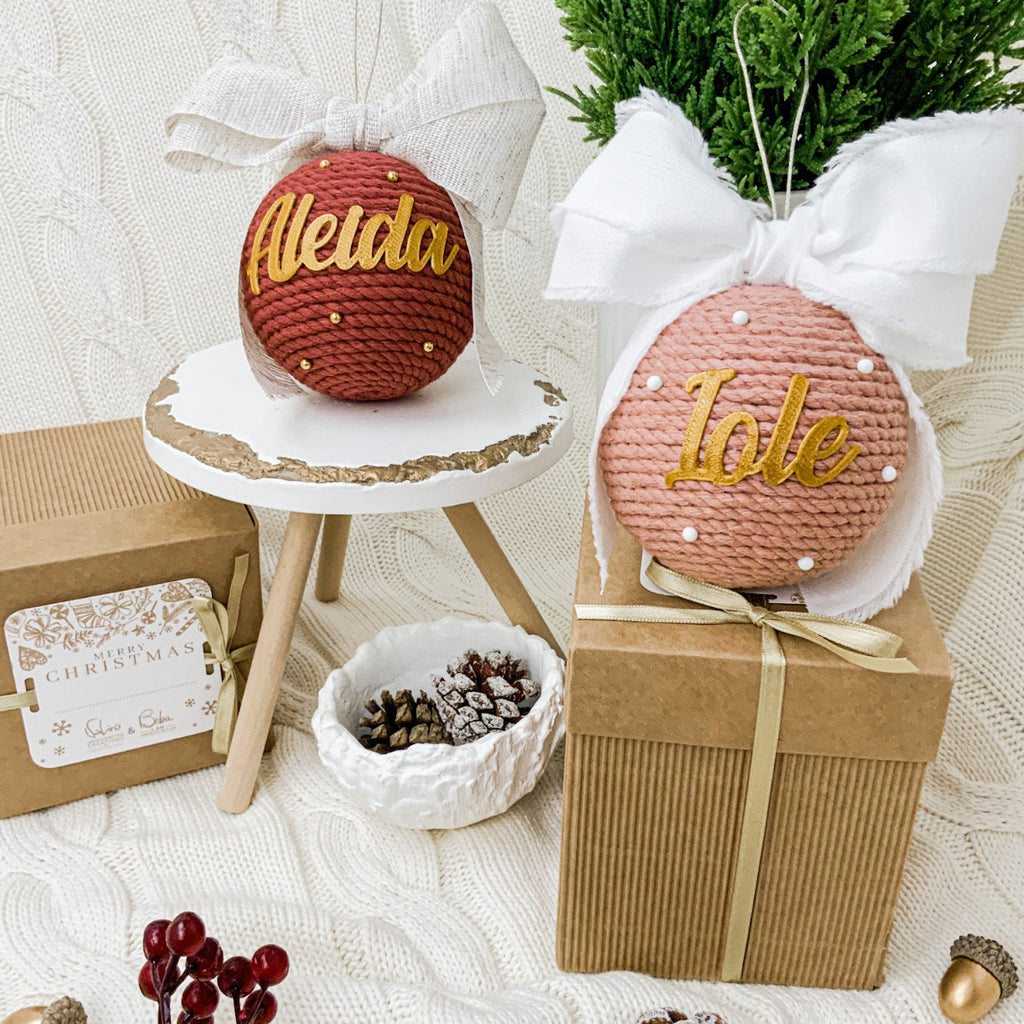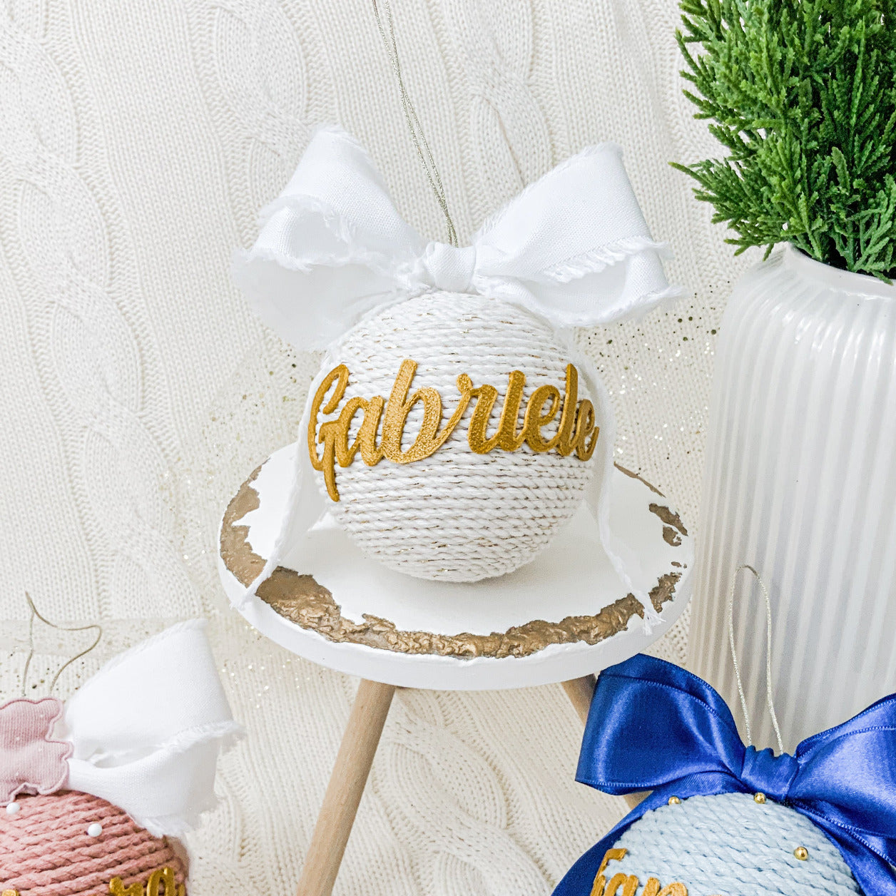 Porta la magia del Natale nella tua casa con le nostre Palline di Natale in corda da circa 11 cm, personalizzabile con nome, colore e decori. Ogni pallina è realizzata a mano con materiali di alta qualità e impreziosita da un elegante fiocco in tinta, ideale per aggiungere un tocco unico e raffinato al tuo albero o ai tuoi ambienti natalizi.